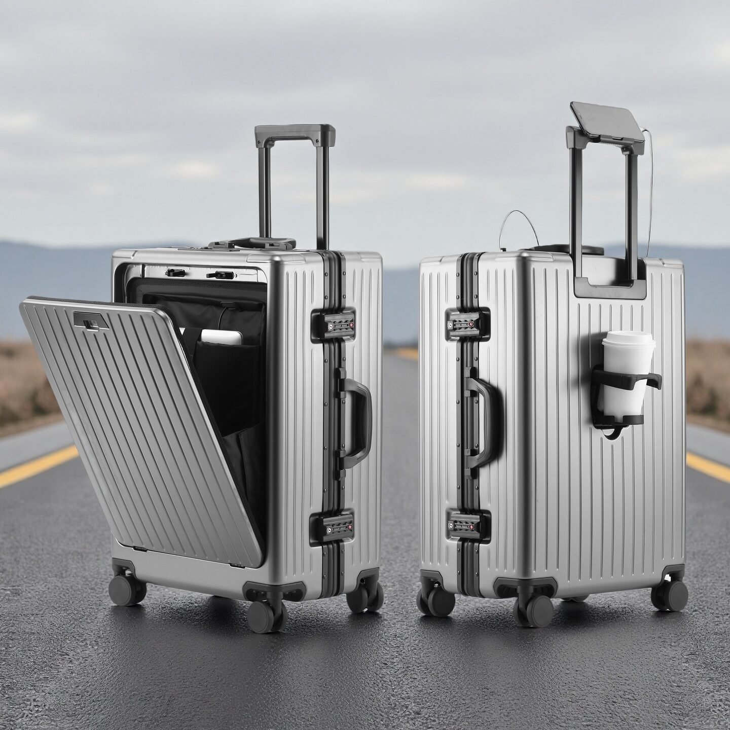 Functional Luggage with Front Opening, Aluminum Alloy Frame PC Hard Shell, Digital TSA Lock, YKK Zipper, Cup Holder, USB Charging Port, Side Hooks, Spinner Wheels, Dry&Wet Separation, with PC+ABS Materials to Make Your Travel Easier.
